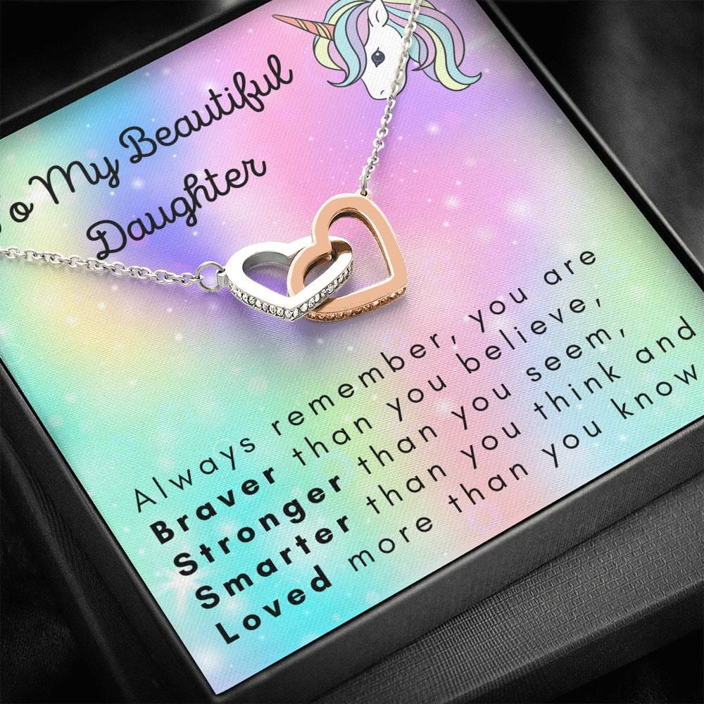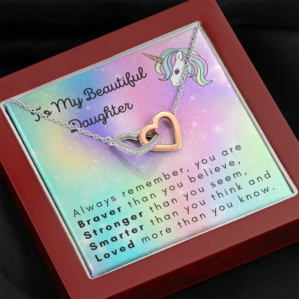 Two hearts embellished with Cubic Zirconia stones, interlocked together as a symbol of never-ending love. Made with high quality polished surgical steel. Cable chain measures 18 inches with a 4 inch extension, and fastens with a lobster clasp.