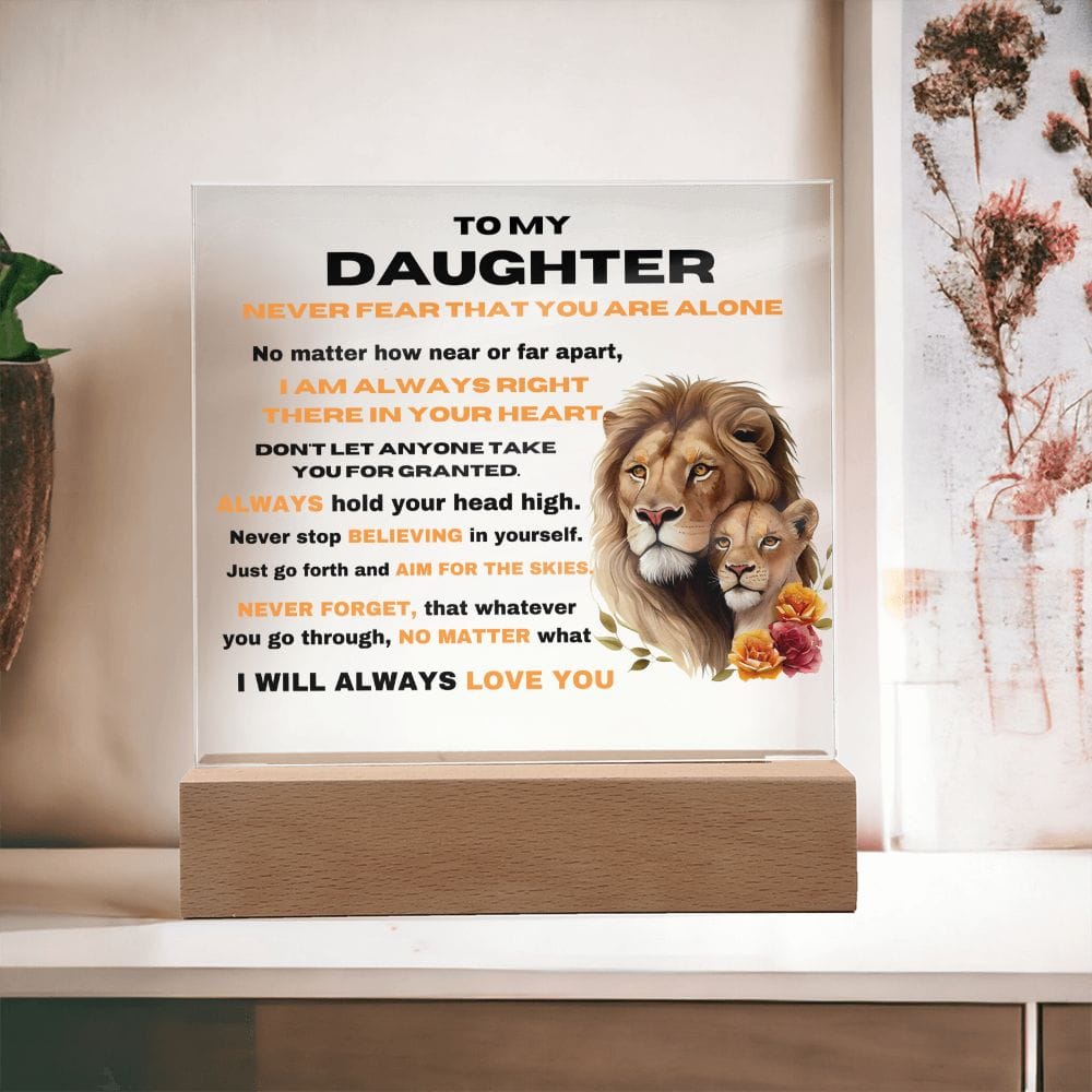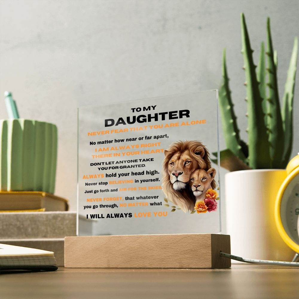 Showcase your heartfelt message on our Square Acrylic Plaque.  Crystal-clear acrylic highlights your sentiment, while the sleek wooden base adds sophistication. Make it even more captivating with the LED wooden base upgrade. Ideal for your daughter or a cherished loved one, this plaque beautifully conveys your love and appreciation.