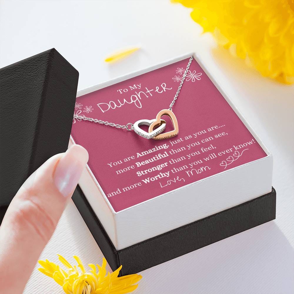 Two hearts embellished with Cubic Zirconia stones, interlocked together as a symbol of never-ending love. Made with high quality polished surgical steel. Cable chain measures 18 inches with a 4 inch extension, and fastens with a lobster clasp.