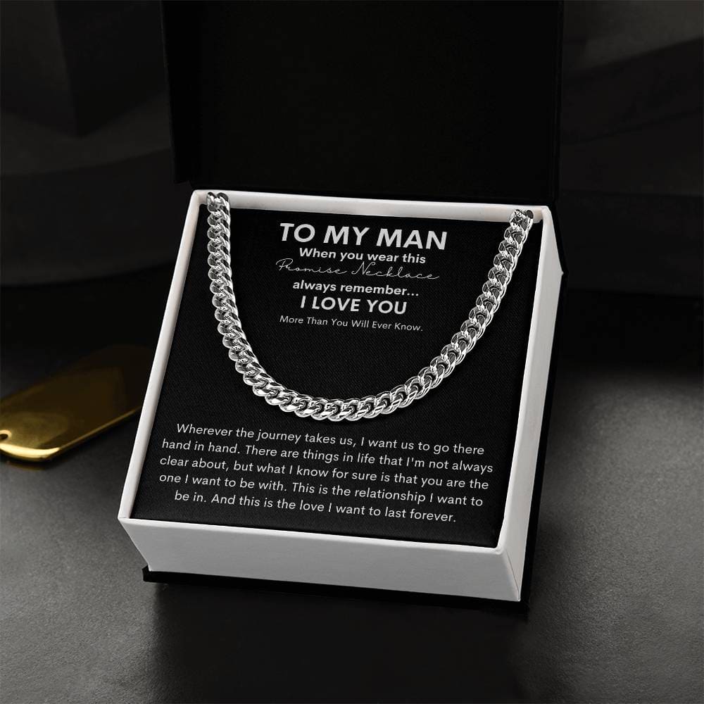 Exclusive Message Card: "TO MY MAN - When you wear this Promise Necklace. always remember... I LOVE YOU More Than You Will Ever Know. Wherever the journey takes us, I want us to go there hand in hand. There are things in life that I'm not always clear about, but what I know for sure is that you are the one I want to be with. This is the relationship I want to be in. And this is the love I want to last forever."